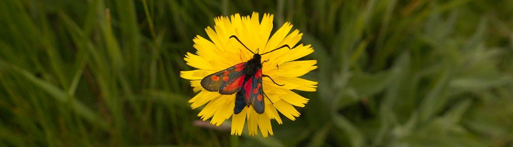 and with the weather warming up lots of interesting insects around too – we got close to colourful Five-spot Burnet moths in the meadow…