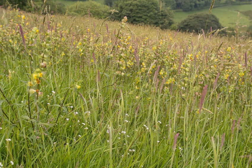 This was followed by a presentation by Laurence Brooks who talked about his holding near Pen Y Bont, in the West of the county. Laurence explained that he’s trying to manage it as a productive, sustainable holding using a mix of cattle and sheep. Various issues were discussed – the potential impact on field ecology from installing ponds and drains, small scale issues with bracken management, and a lively discussion followed the issue of whether to use yellow rattle as a management tool in an “improved” pasture as an aid to increasing floral diversity. This seems to be a topics where different meadow owners have different experiences. Is yellow rattle palatable to different livestock, and in hay? Again there were differing opinions, and the yellow rattle topic has been discussed on these pages before. Click here and here for more.