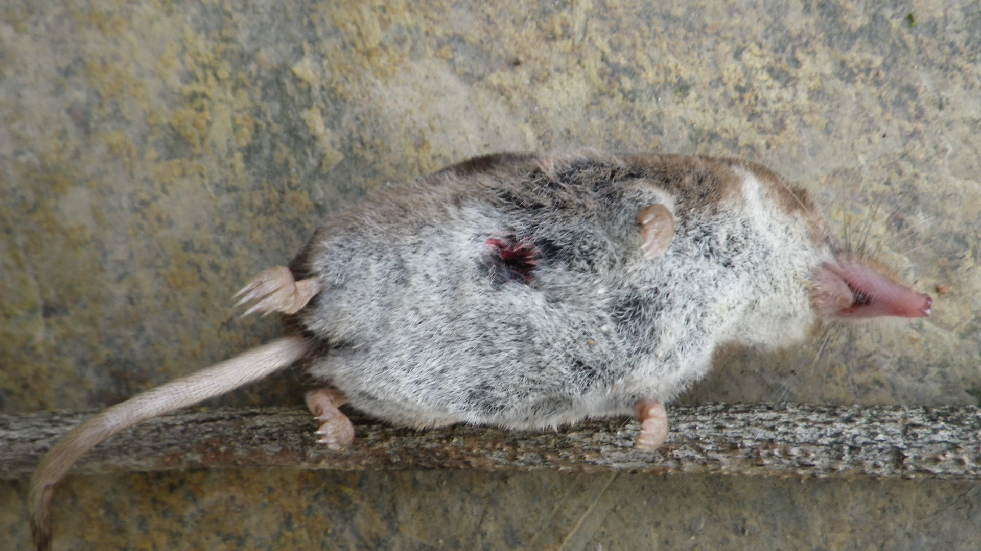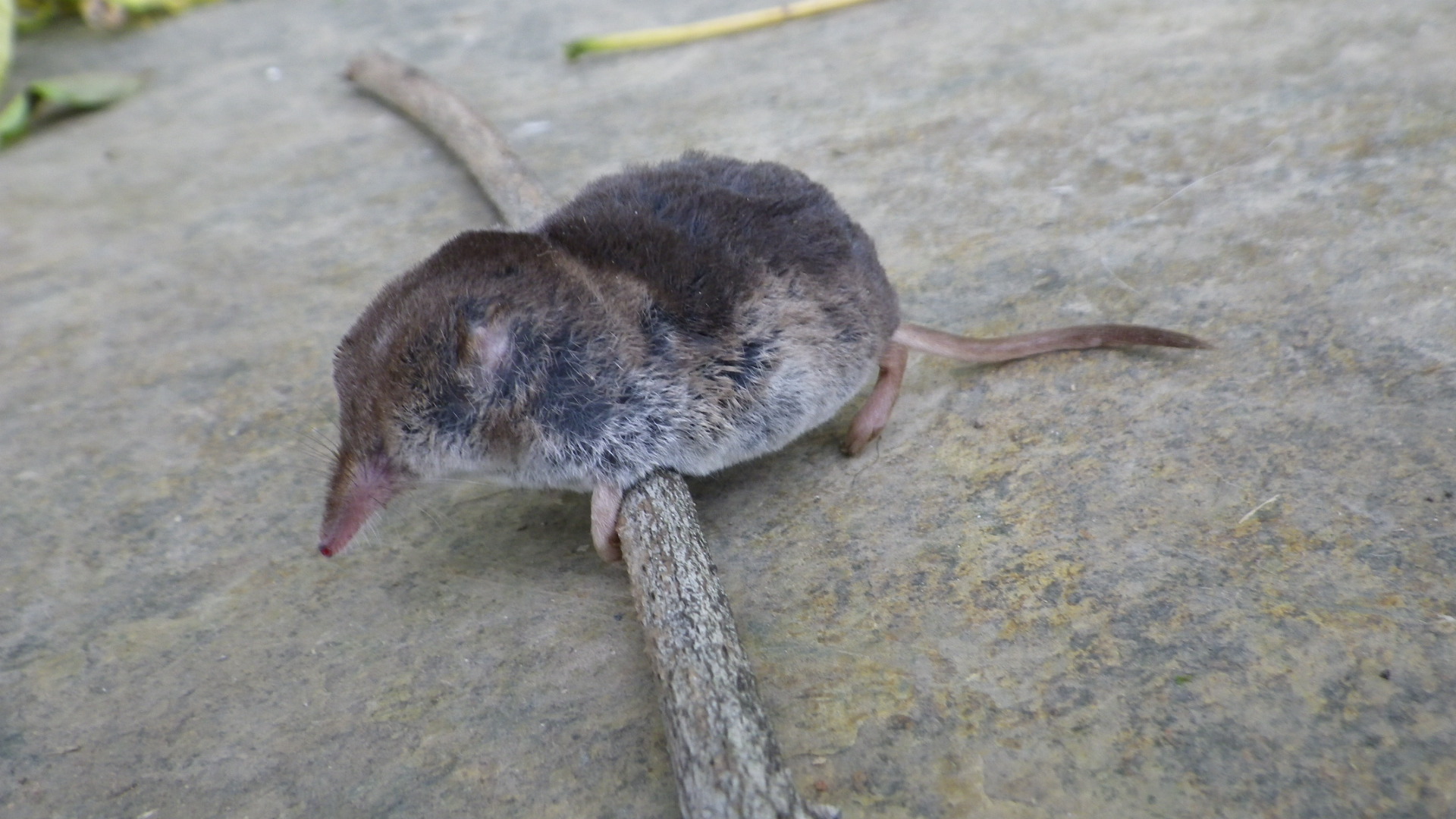 And here is a dead shrew that I found this morning in the very same spot as the weasel had been! And – like the weasel – it was still warm and plump and undamaged, apart from one small hole as shown.imgp0023