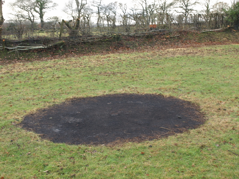As you can see from this picture, this was the amount of brush collected before we’d cut most of the hedge, so you can imagine how much there was in total, we didn’t have a wide enough angle lens to photograph it. We followed the consensus of advice from comments on the blog, and disposed of the brush by burning, with one bonfire on our side and a smaller one on Dorian’s side – with his permission of course! If you get a hot fire going with a few old cardboard boxes, pallets and scrap wood, it’s surprisingly easy to burn a vast amount of brush very quickly. The burnt area on our field (with a smaller one on Dorian’s) is only a couple of metres in diameter …