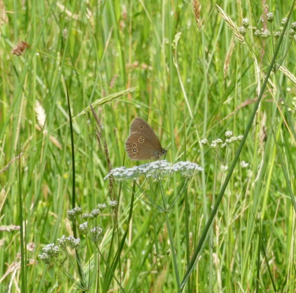 The other immediately obvious feature of the meadows on this very hot sunny day, was the insect diversity. Ringlet butterfly on Whorled Caraway, below…