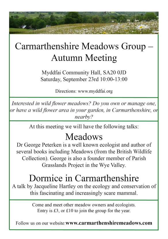 We have George Peterken, author of the seminal book on meadow management, “Meadows” coming to talk to us, from Monmouthshire, along with Jacqueline Hartley talking about Dormice, which have been found in the county.