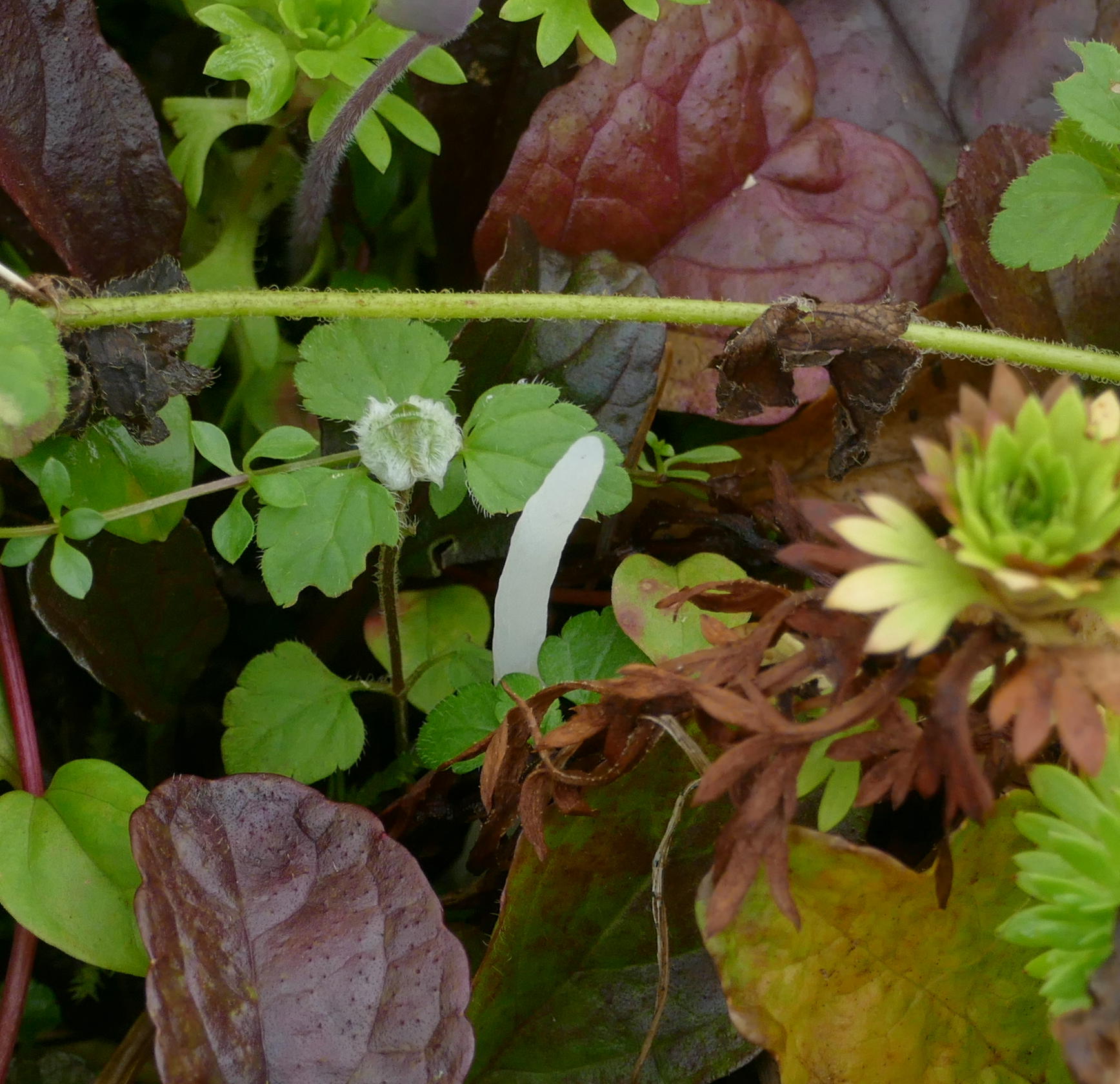 The day after Lynne had told me about her exciting find, a much more benign sounding fungus popped up in our created grass free “wildflower meadow” just outside our front door. I hadn’t found this fungus before on our property, and it’s commonly called either “White Spindles”, “White Worm Coral” or “Fairy Fingers”, Clavaria fragilis, below. Click here for more on this fungus.
