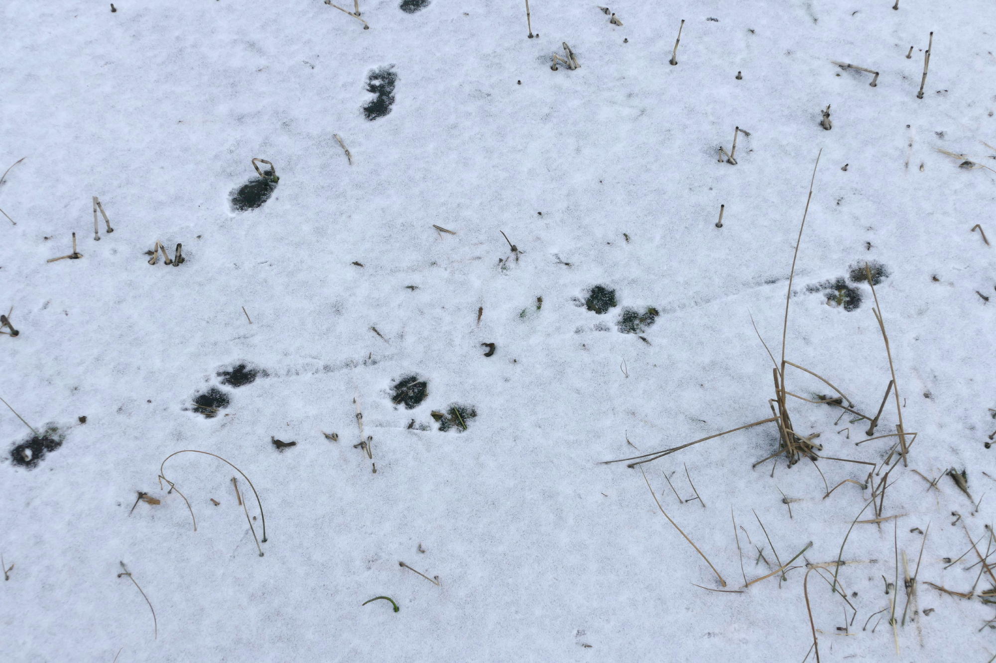 and 5 toed, otter tracks in thin snow over the frozen pond…