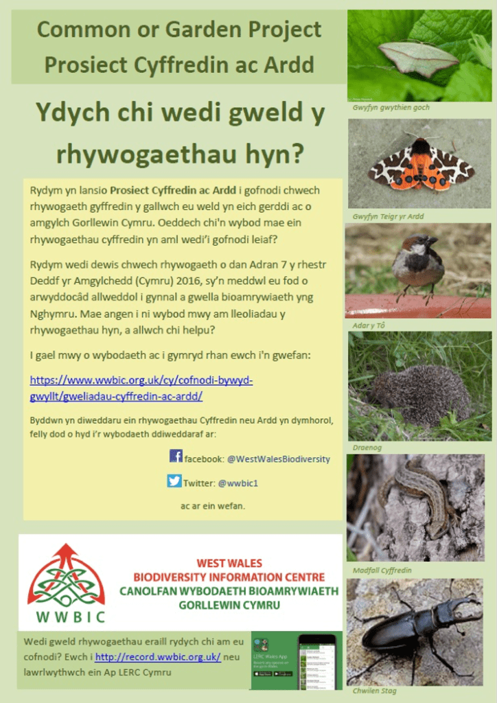 During the lockdown, many of us have been taking the opportunity to do some recording of species in our own patch, or at other local sites we can visit during our permitted exercise. Apart from the Meadows Group’s own glow worm project (see the poster in the previous blog entry) there is the “Common or Garden” recording scheme from the West Wales Biodiversity Information Centre (WWBIC). Every so often, the Common or Garden species list changes, this is to reflect the periods at which the species are most likely to be seen. The new list is here: