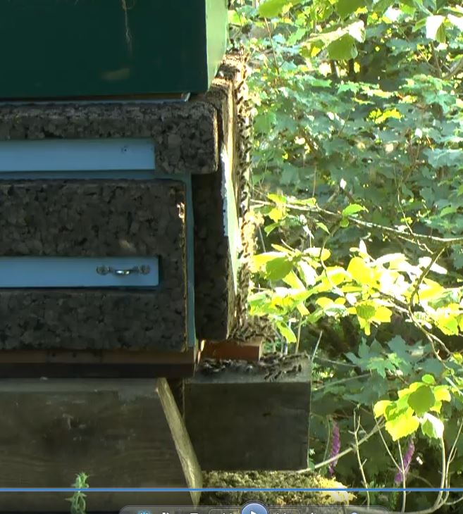 I’d often wondered just how many, if any “wild” honey bees still existed in our upland neck of the woods, and so inspired by his research into how swarming colonies manage to select from the typically 20 or so potential new home sites that they will check out, I’d constructed 4 different variants of boxes last winter. They were all a little different, but equally all met his top 5 criteria for suitable future nest sites and I set them out at various points around our small holding. Fingers were firmly crossed that after smearing a little beeswax/lemon/geranium oil mixture around the entrance to alert scout bees to their presence, one or two might pass muster with any scout bees in the area. In the end all 4 were taken up by swarms between April and July this year (one was taken up twice, after a first small swarm failed in wet weather early on). So it seems that our local Welsh bees operate along the same selection criteria as Seeley’s American bees. And I even managed to video 3 of the swarms arriving which was a bonus – rather poor screen captures from the videos below …