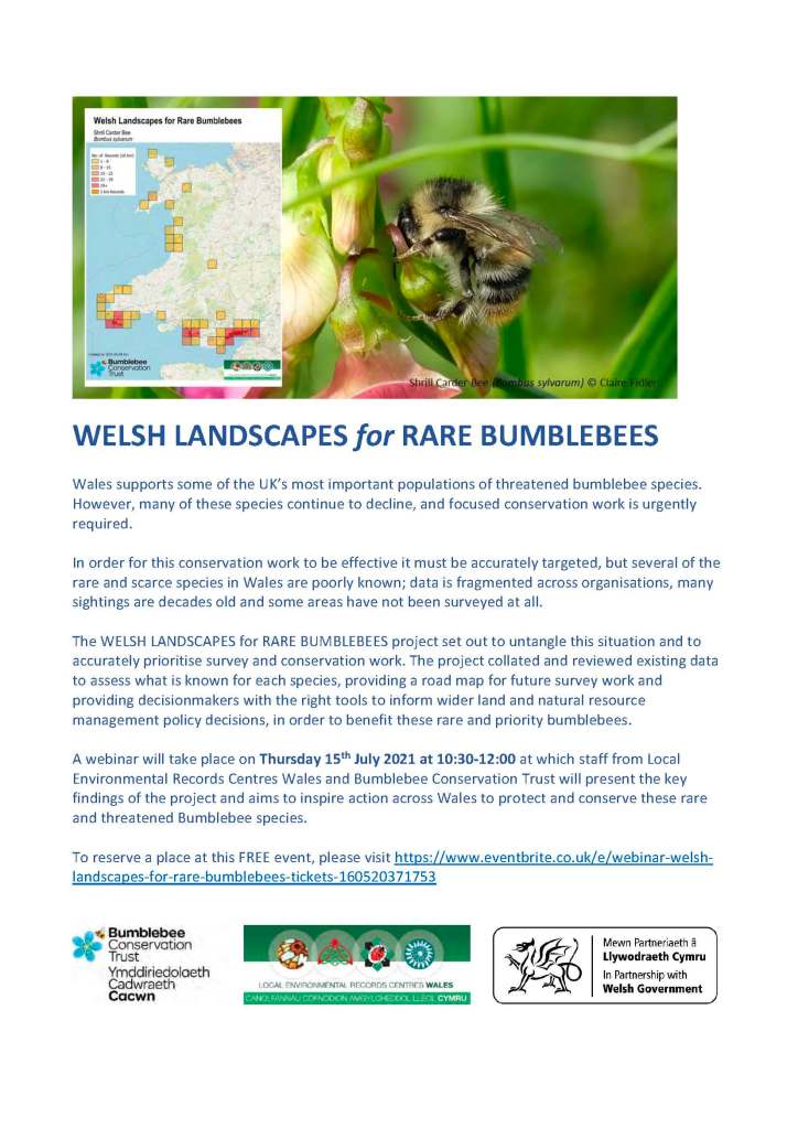 Welsh landscapes for rare bumblebees – a talk run by the Environmental Records Centre Wales and Bumblebee Conservation Trust with an aim to inspire action across Wales to protect and conserve these rare and threatened bumblebee species. 10.30 am to 12.