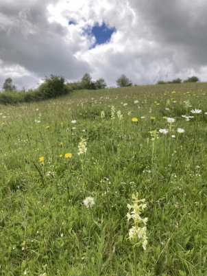 After a lunch at a nearby tea rooms, some of us went on to visit the Coronation Meadow for Radnorshire which was only a couple of miles away. Despite that, it was quite distinct from the meadows at Sorcha’s farm. There were Oxeye Daisies and Greater Butterfly Orchids in large numbers: