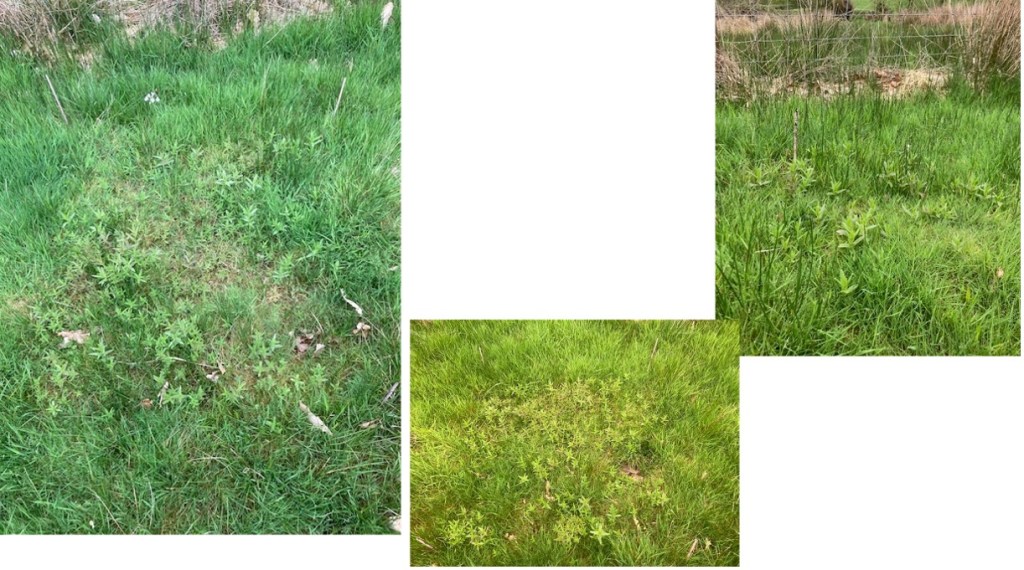 The 186g of mixed seed and chaff was divided equally between the six plots, so 31g was sprinkled by hand on each plot. The seed wasn’t trampled or trodden in. A baseline survey on 15/09/2022 of the test plots found Common Marsh Bedstraw, Common Mouse-ear, Common Sorrel, Creeping Buttercup, Greater Bird’s-foot Trefoil, Sharp-flowered Rush, Soft Rush, and Wild Strawberry.