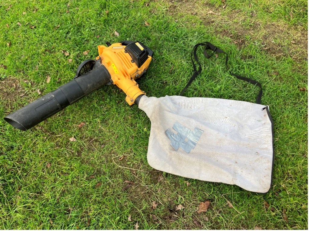 We decided to look into a much less costly option – a leaf vacuum. Many models of leaf blower are available, and some have a facility for a cloth bag to be attached where the air is blown out, and a pipe attached to the air intake. I already had an elderly example of such a device which I’ve used for collecting sawdust and shavings after cutting up firewood.