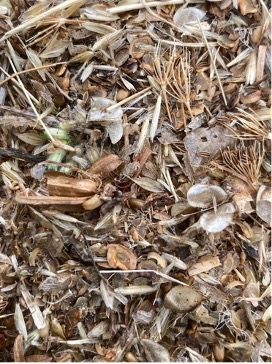 The leaf vacuum was used to hoover up seeds from the area chosen, which took about 10 minutes. There were seeds, and quite a lot of chaff – non-seed plant material – in the bag. It was emptied, and the contents weighed – there were 186g of material. It seemed dry, so we decided it wasn’t necessary to dry it any further, nor did we sieve it or sort it in any way, and we took it to LJM’s smallholding near Siloh.