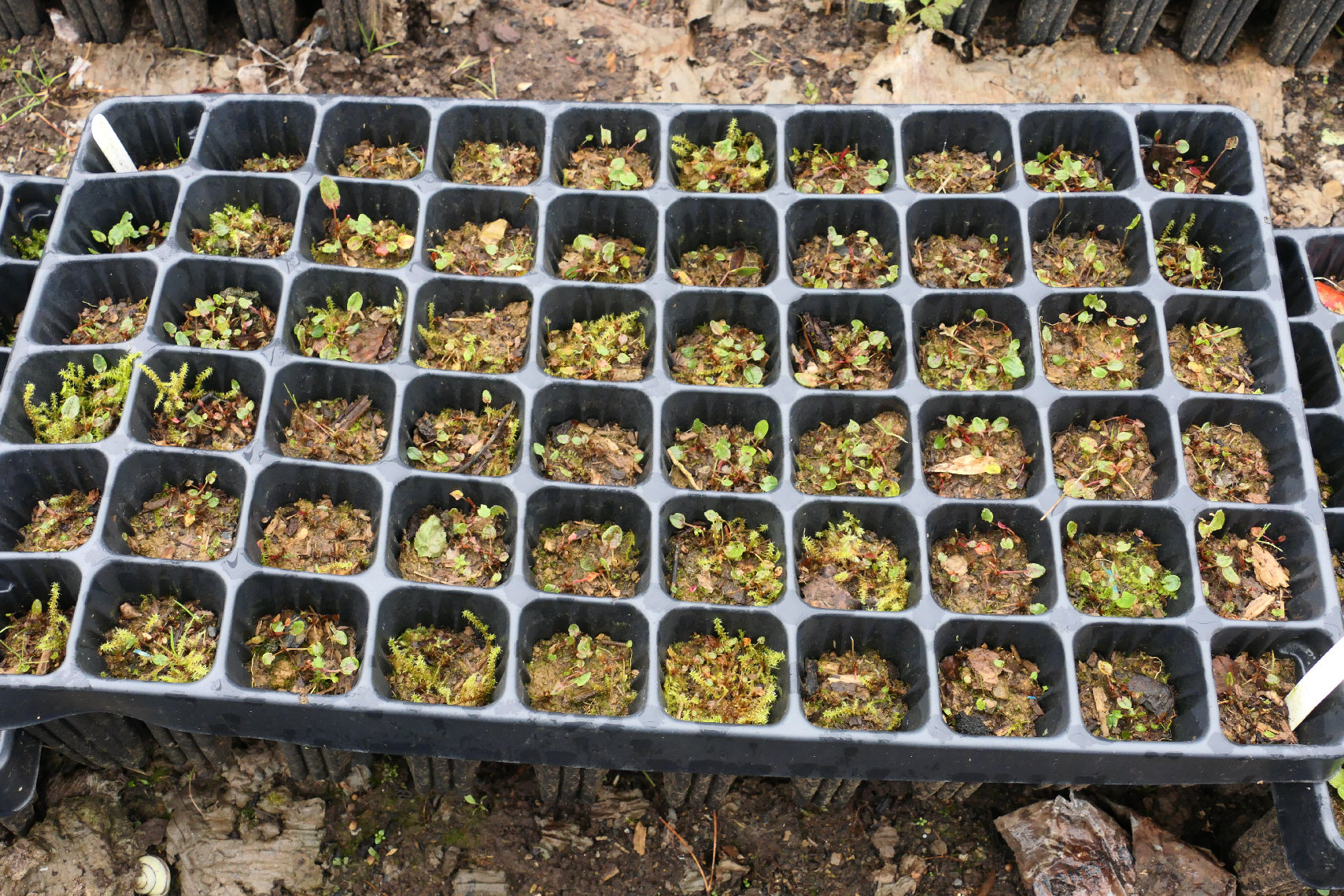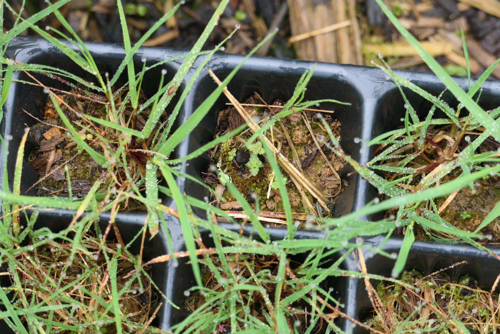 These grass/hemiparasitic plugs will probably be the first to reach a size where they can be planted out. The ground is certainly wet enough! We really need a bit more warmth and sunshine first, I think, to get them a bit stronger, with root systems that reach down to the base of their containers.