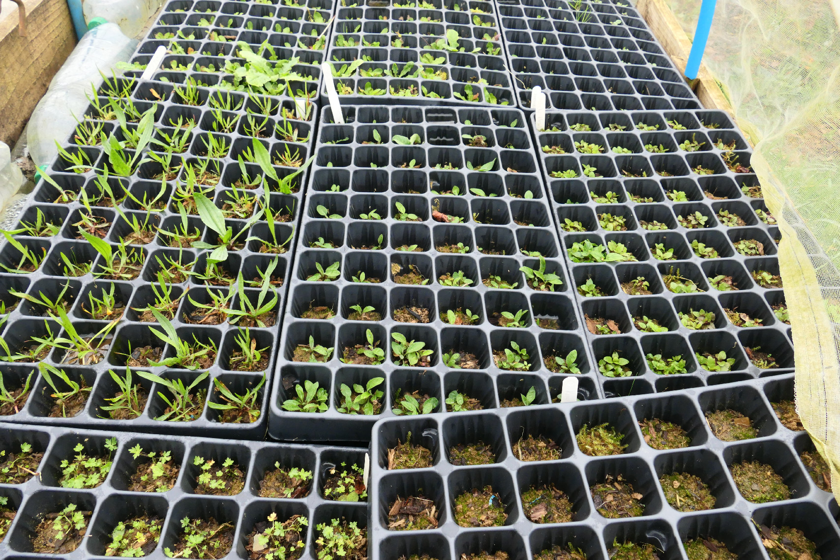 There have been many days when most of the root trainers have had standing water in them for days on end. Some plugs must have had a stone impeding drainage completely and nothing has survived in some of these. Some trays have been left out in the open, although many have been overwintered beneath a simple hooped cover of enviromesh, which will have given some slight protection from strong winds, in an exposed site, and a degree of temperature protection on those rare cold nights.