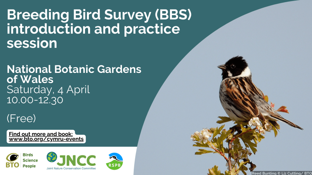 Are you a birdwatcher and would like to help with the conservation of Wales’ birds? Gethin from the BTO is running a free Breeding Bird Survey (BBS) training event at the National Botanic Gardens of Wales on April 4th, from 10:00-12:30. Taking just a few hours to do each spring, be sure to join us for this welcoming and supportive session. https://www.bto.org/our-work/events/breeding-bird-survey-introduction-practice-session-national-botanic-garden-wales
